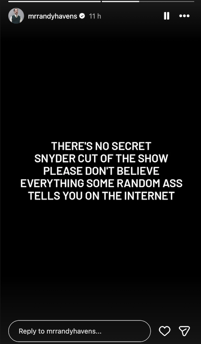 Randy Havens, Mr. Clarke in the show, doesn't think so. A recent Instagram story (pictured below) states that 'there's no secret snyder cut of the show', taking a stance against anyone claiming otherwise. 'Snyder cut' refers to 2021's 4 hour long Jack Snyder's Justice League, what the original 2017 film was intended to look like without the cuts and reshoots that whittled it down to only contain 30 minutes of Snyder's original footage. In short, a cut with all the original bits left in. Havens then proceeds to say 'please don't believe everything some random ass tells you on the internet', a useful piece of advice for everyone.